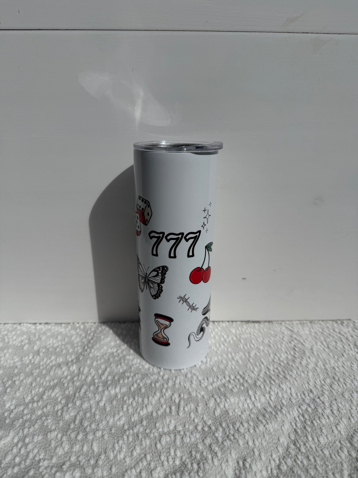 Slide lid, also comes with a clear acrylic straw.
